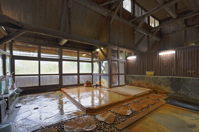 浴場は木のぬくもりを感じる情緒あふれる空間。大きな窓は開放感があり、秋山郷の景色を眺めながら温泉を楽しめます。日頃の喧騒から離れてゆっくりと心と身体を癒やす、そんな時間を過ごすことができます。