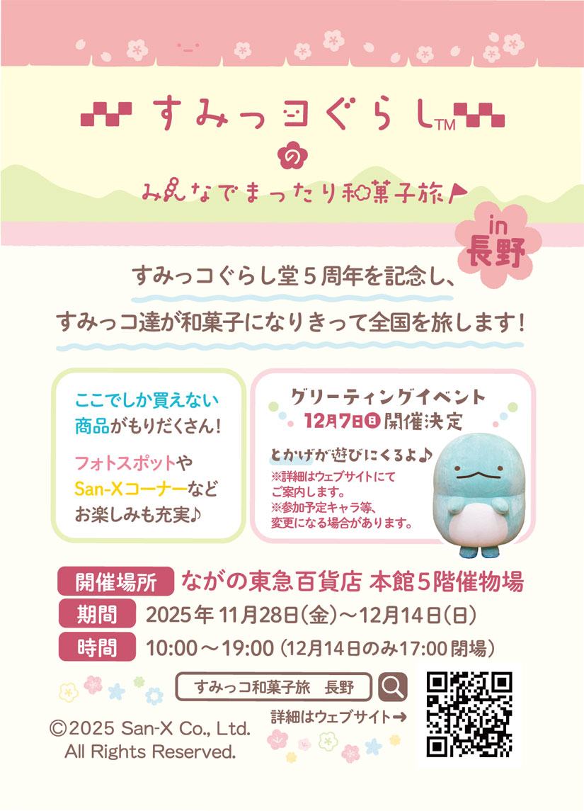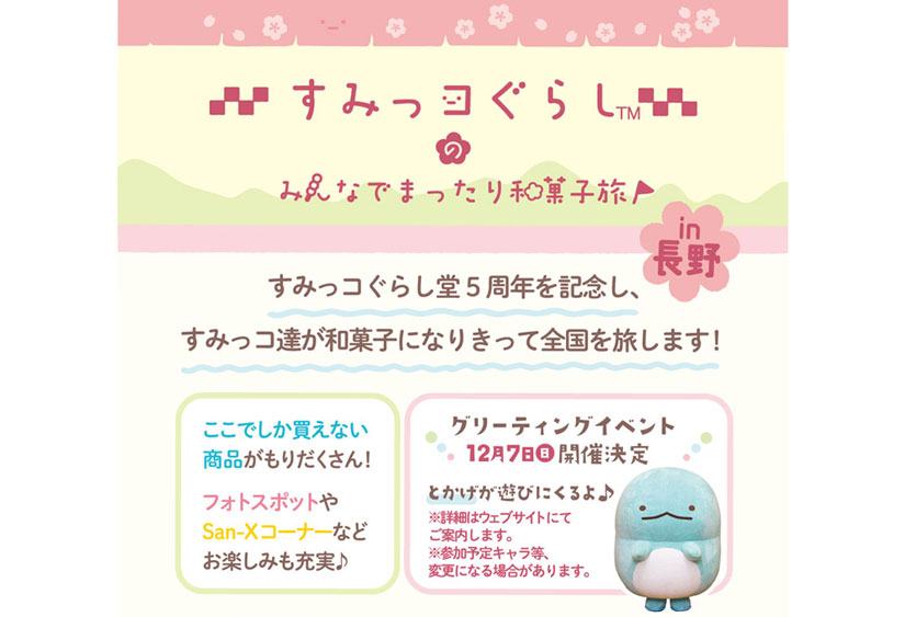長野市・長野駅前の「ながの東急百貨店」で、〈すみっコぐらし〉が全国6都市を旅するイベント『すみっコぐらしのみんなでまったり和菓子旅 in 長野』が、2025年11月28日(金)~12月14日(日)にかけて開催。
