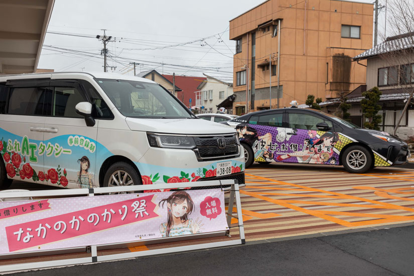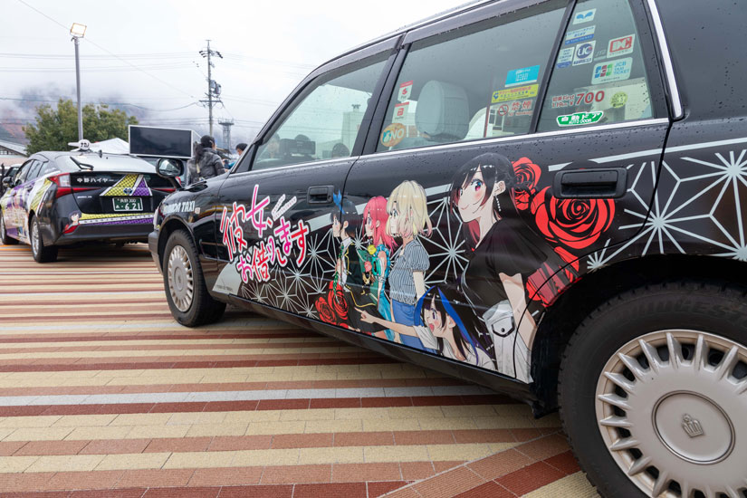 かのかりのキャラクターが描かれたラッピングタクシーが運行。