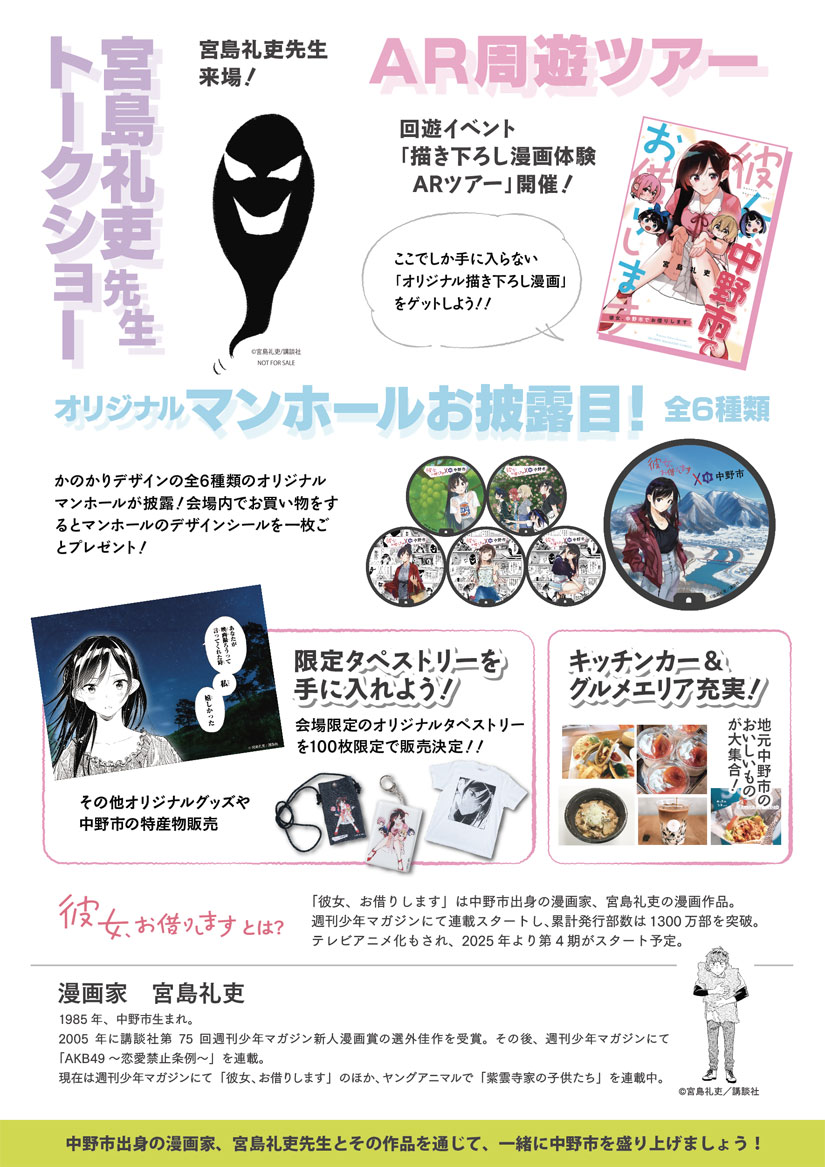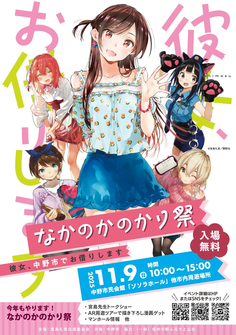 2025年11月9日(日)に、長野県中野市の「中野市民会館 ソソラホール」で、人気漫画「彼女、お借りします」と中野市とのコラボイベント『なかのかのかり祭』が今年も開催。中野市出身の作者・宮島礼吏先生によるトークショーのほか、中野市を舞台にした番外編「宮島と彼女」に描かれたシーンを再現した『AR周遊ツアー』、限定オリジナルグッズの販売、コラボデザインのマンホールのお披露目など多彩なイベントが目白押し。『AR周遊ツアー』では、全エリア踏破でオリジナル描き下ろし漫画の配布も!