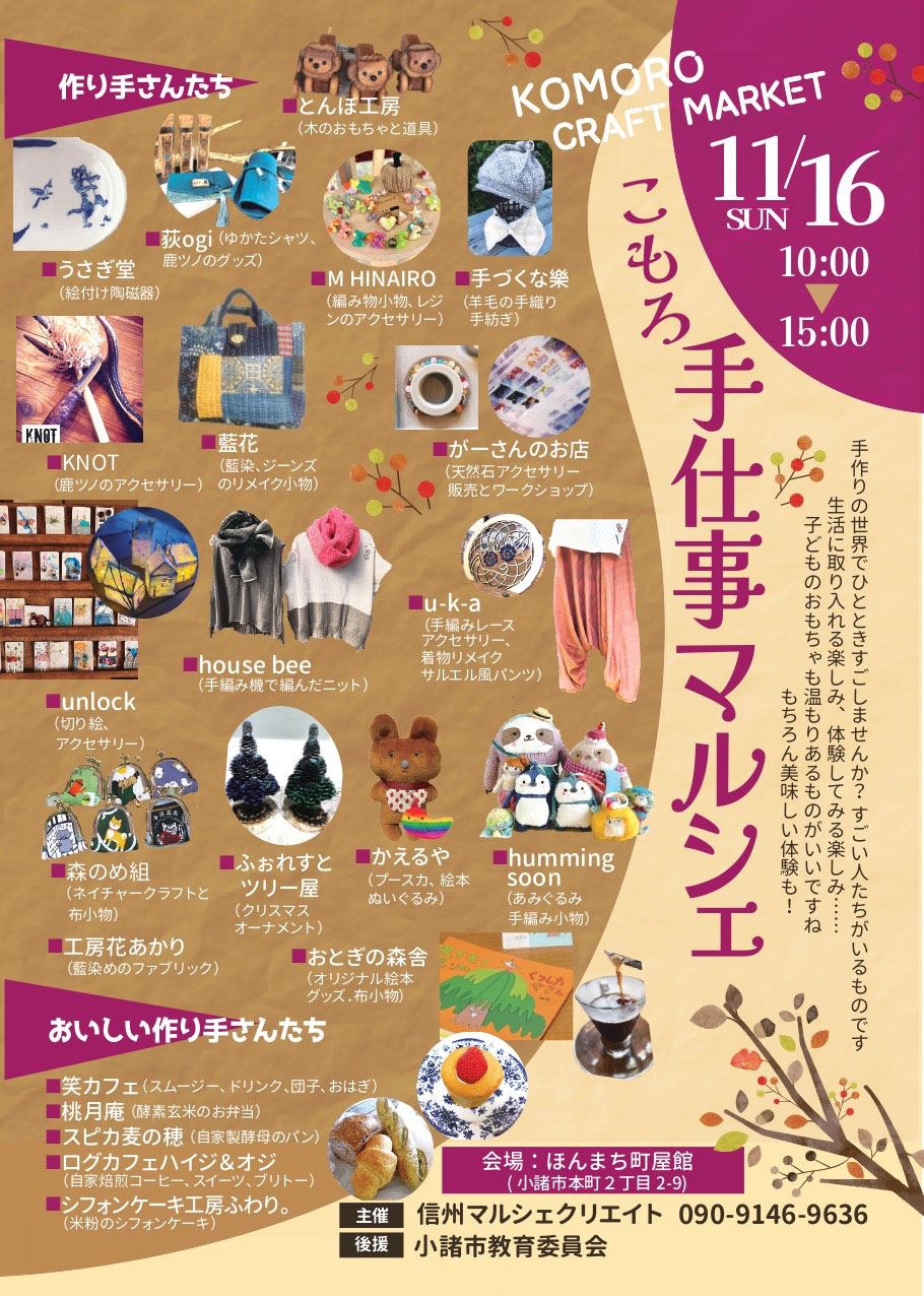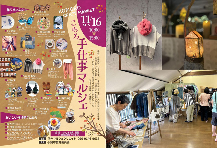 長野県小諸市の「北國街道 ほんまち町屋館」で、屋内クラフト市『こもろ手仕事マルシェ』が、2025年11月16日(日)に開催。