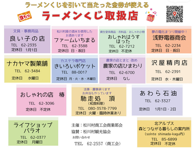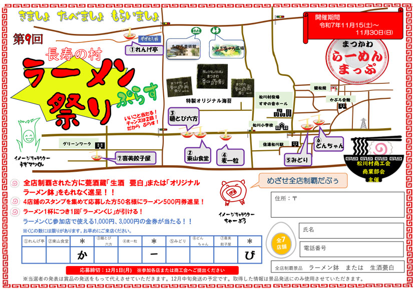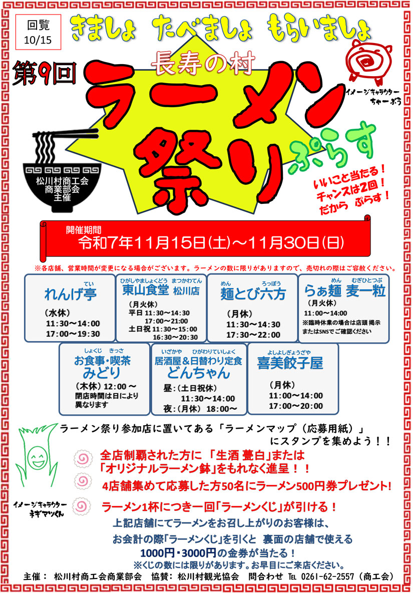 2025年11月15日(土)から11月30日(日)まで長野県の松川村で『第9回ラーメン祭りぷらす』が開催。村内の参加ラーメン店全7店を巡る毎年恒例のイベントで、1杯食べると1000円分・3000円分の金券が当たるくじにチャレンジできます。当たった金券は、村内のラーメンくじ取扱店で使用可能。