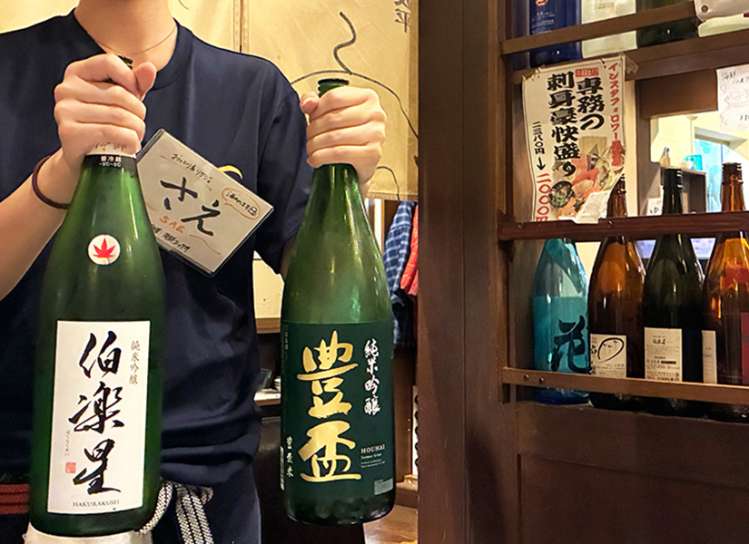 そして、やっぱり魚介にはお酒も欠かせません。ということで本日は日本酒(1合990円)をセレクト。地元の酒店から仕入れた、県内外の選りすぐりの銘柄が勢ぞろい!酒店イチオシの「隠し酒」や、リニューアル後に入荷した日本酒もあり、新しい一本に出会えるはず。店員さんの丁寧な解説もあり、普段飲みなれない方にもオススメ。