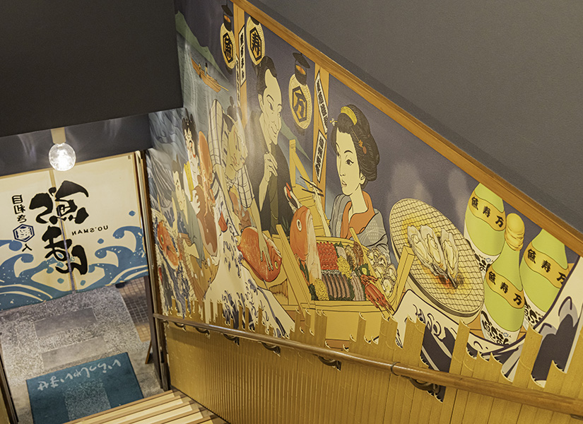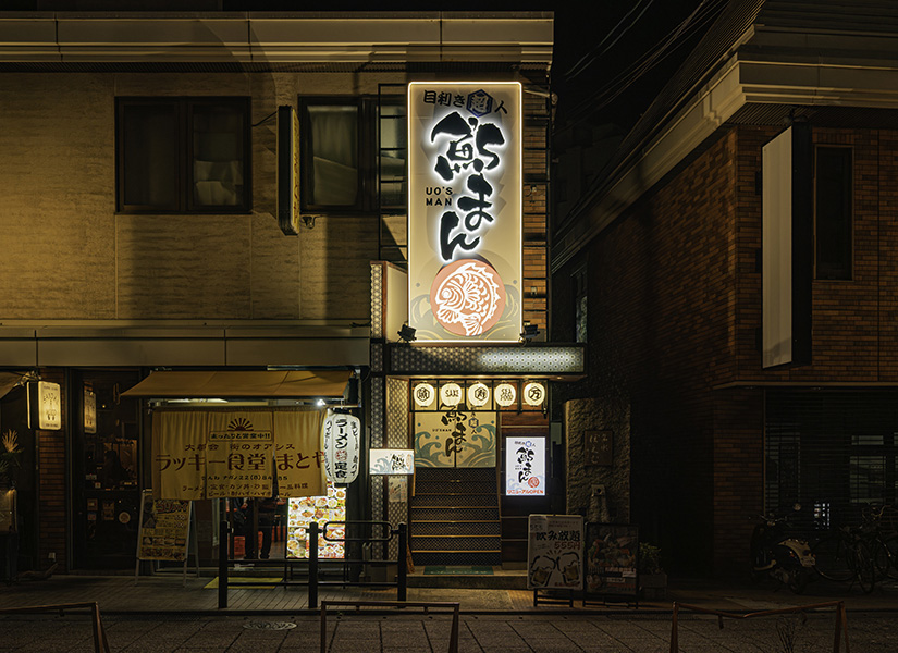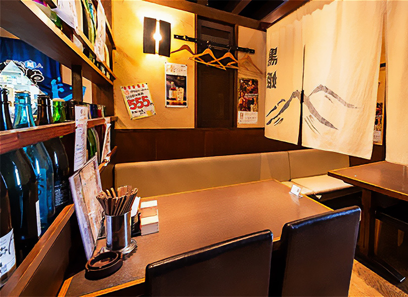 新しくなった外観は、ライトアップされた看板や、階段の壁に描かれた絵がとても華やか。店内は変わらず、ゆったり落ち着いた空間で食事を楽しめます。壁には日本酒の瓶がずらり。メニュー名も個性的で、見ているだけでワクワク感が止まりません!