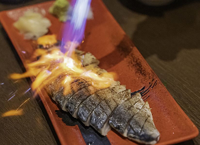 また、「炙り〆サバ」(1,290円)は、目の前でバーナーで炙るライブ感が魅力。火が入るたびに脂がじゅっと弾け、立ちのぼる香ばしさがたまりません。とろりとした脂の甘みが口いっぱいに広がり、〆サバの酸味とのバランスも絶妙。