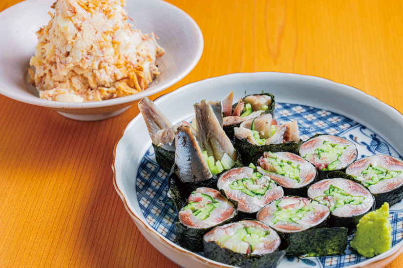 見た目にも華やかなメニューがそろいます。写真は「イワシのりまき」(900円)と「くんせい玉子ポテサラ」(500円)。