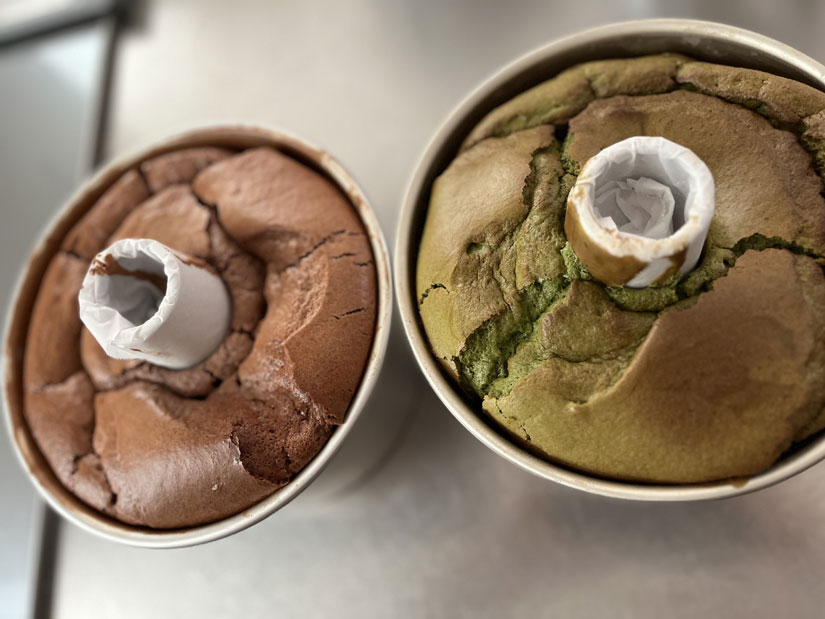 店舗には5〜6種類のシフォンケーキが揃います。プレーン、ココアは定番として並び、その時々に合わせて季節の食材や地元産の果物や野菜を活かしたフレーバーも展開。