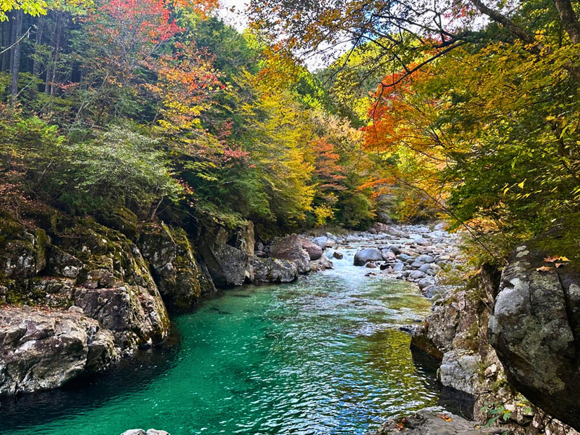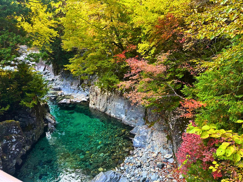長野県木曽郡大桑村に位置する阿寺渓谷は、その抜群の透明度から生まれる独特の水の色が魅力のスポット。特に紅葉の時期には「阿寺ブルー」と呼ばれる碧い水と、紅葉の赤黄のコントラストが見事な景観を作り出しています。