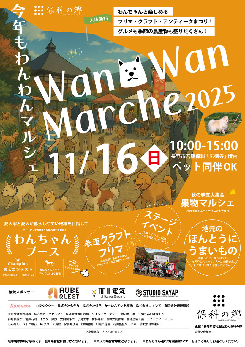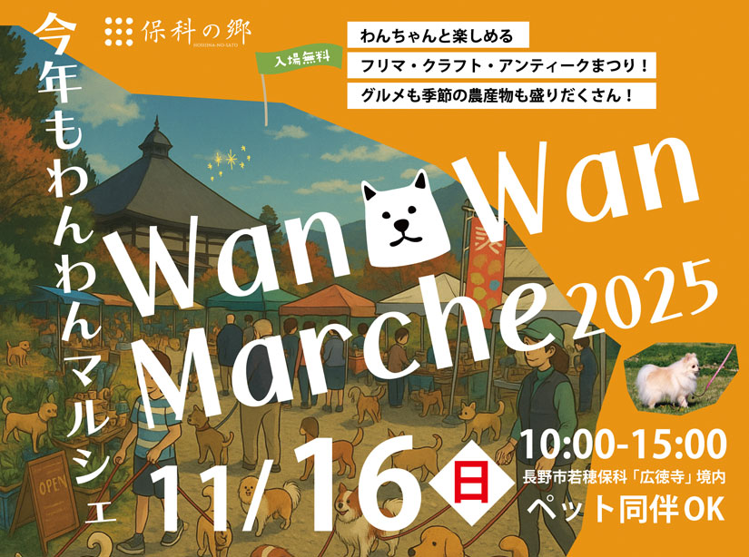 2025年11月16日(日)に長野県長野市若穂保科の「広徳寺」の境内と「ねこぽぽテラス」を会場に、特定非営利活動法人保科の郷が主催する『WanWan Marche2025(ワンワンマルシェ)』が開催。40店以上のフリマやクラフト、アンティーク市、地元のうまいものを集めたグルメブース、季節の農産物や果物販売などの果物マルシェなど並びます。また、ステージ発表や、犬と一緒に楽しめるわんちゃんブースも楽しめます。