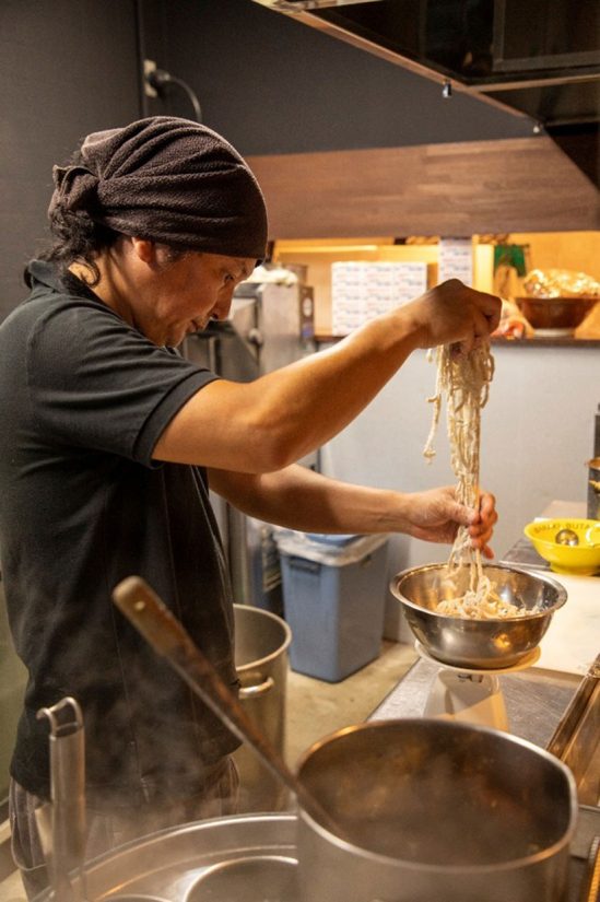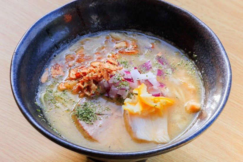 一杯に4羽分の鶏ガラを詰めこんだスープをさらに煮詰め、ギリギリのポイントを見極めた超濃厚鶏白湯スープが自慢。国産小麦を使った自家製太麺とよく絡み、食べごたえ十分。