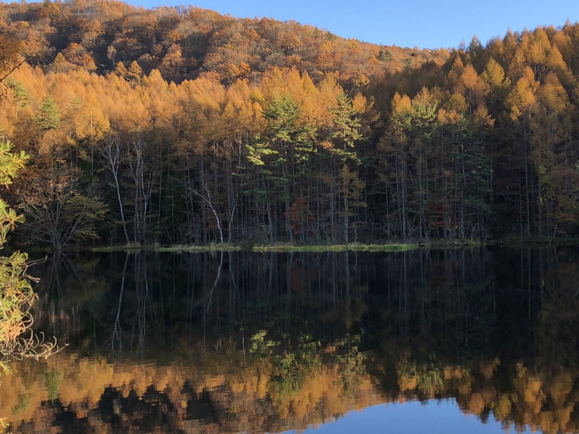 長野県茅野市にある、標高1,500mの山あいにひっそりと佇む、日本を代表する画家・東山魁夷氏の名作「緑響く」のモチーフにもなったことで有名な池「御射鹿池(みしゃかいけ)」。鏡のような水面に四季折々の風景を映し出す美しい池で、静かな水面には背景の山々が逆さに映り込み、まるで幻想の世界に迷い込んだような光景が広がります。周囲を囲むカラマツ林は、季節ごとに表情を変え、秋には黄金色に輝く黄葉が水面に映り込み、一面が金色に包まれたような絶景を生み出します。