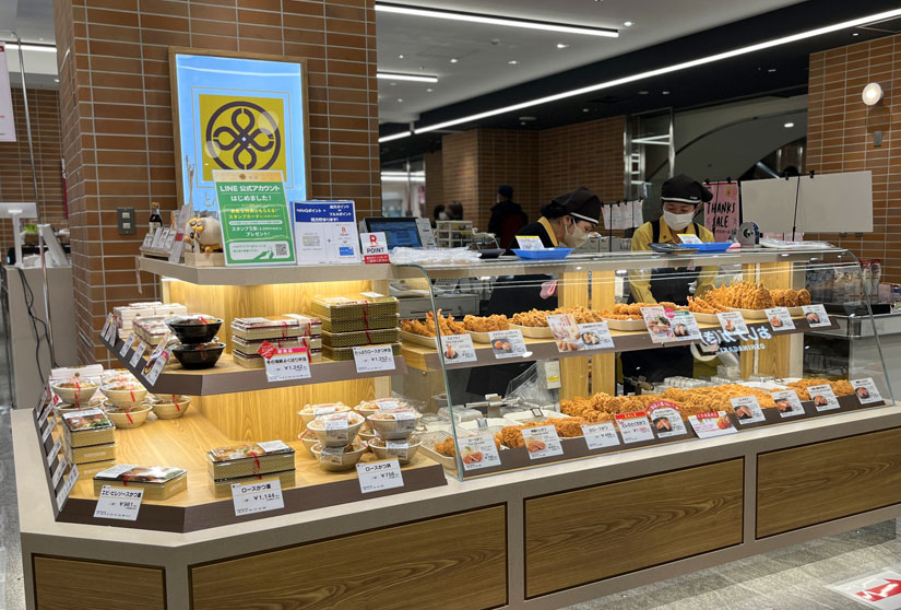 人気の「まい泉」。「ロースかつ」「ヒレかつ」「メンチかつ」などの揚げ物に加え、「ロースかつ丼」756円、「ロースかつ重」1144円、「エビ・ヒレソースカツ重」961円などお弁当も充実。