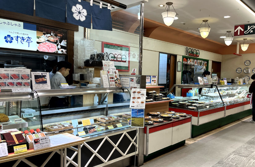 「すき亭」「イタリアンキッチン ボスコ」もエスカレーター近くで営業。「すき亭」は牛すき焼重・豚ヒレカツなどのお弁当や揚げ物がそろいます。