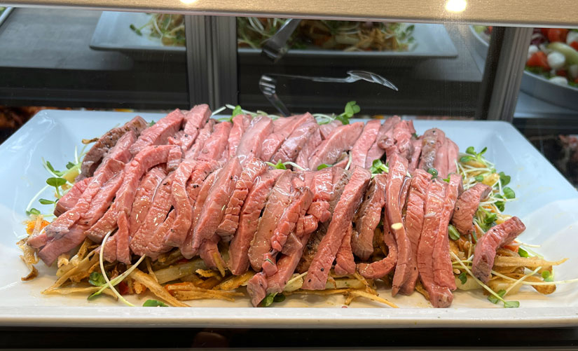 「牛肉のグリル 霜降りひらたけロースト添え」994円/100g