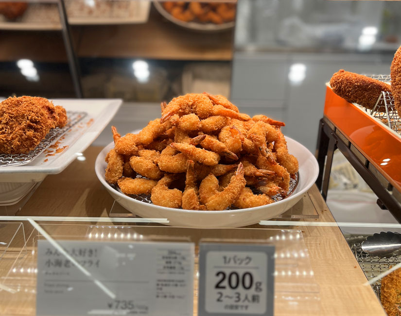 「RF1」人気No.1「みんな大好き!小海老のフライ」タルタルソース付き735円/100g。