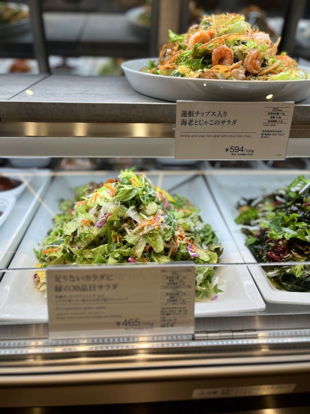 左下「足りないカラダに緑の30品目サラダ」465円/100g。ドレッシングは和風ガーリックまたはシチリア産レモン果汁と石垣の塩のドレッシングを選べます。