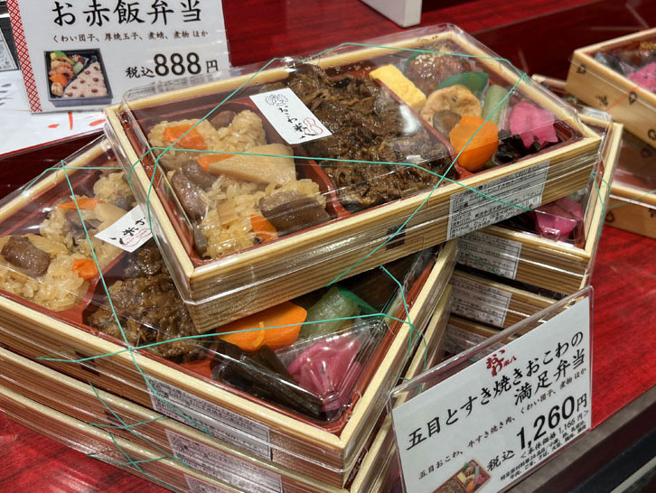 おこわを使ったお弁当も、いなり・すき焼き・カキフライなど多彩です。「三色おこわ」443円とお手頃なものも。お惣菜などと組み合わせても楽しいですね。