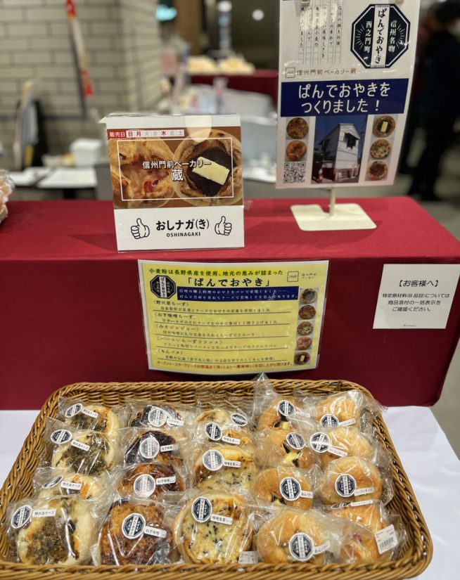 「信州門前ベーカリー蔵」は日・月・木曜。長野県産小麦を使ったパンで、おやきを開発。「野沢菜ちーず」「ねぎ味噌ちーず」「みそジンジャー」「ベーコンちーずフランス」「あんバタ」を用意。