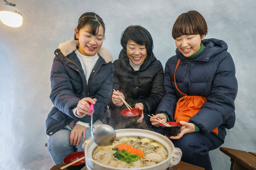 かまくら内で食事ができる「レストランかまくら村」と各種体験や飯山市街地のホテルでの宿泊がセットになったプラン。「のろし鍋」を楽しむシンプルなものから、追加で温泉が付いたもの、スキーと一緒に楽しめる豪華なものまでさまざま!申し込み詳細は〈飯山旅々。〉サイトにて確認。