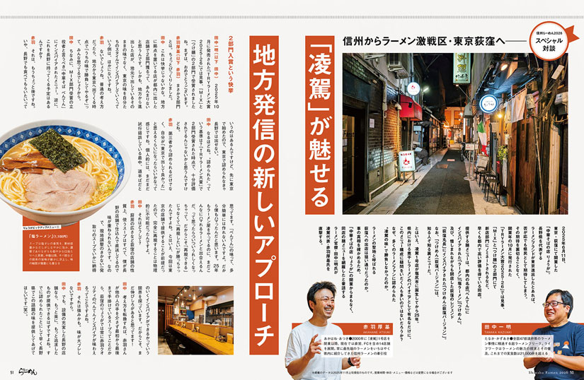 新店部門にノミネートされるなど、早くも都内で高い評価を得ている同店。開業からまもなく、りょうがの麺メニューを網羅したと豪語するラーメン官僚・田中一明氏が凌駕代表・赤羽厚基氏を直撃!