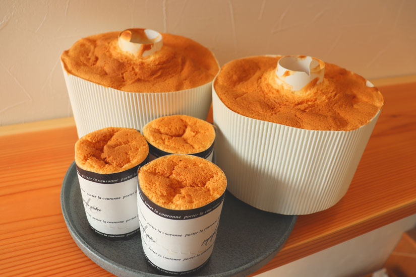 写真の「雲のシフォン」(900円)は、上部の焼き目はこんがりとキツネ色ですが、中は雲をイメージし、白くてフワフワ食感。名取鶏卵が手掛ける良質な卵、その卵白のみを使って雲のような白さへと仕上げたシフォンケーキです。
