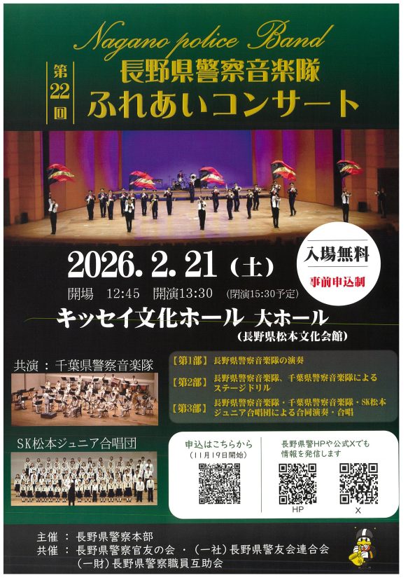 「県民と警察を結ぶ音の架け橋」として活躍する長野県警察音楽隊が、2026年2月21日(土)にキッセイ文化ホール(長野県松本文化会館)大ホールでコンサートを開催します。8年ぶりとなる松本市での公演は、千葉県警察音楽隊との共演や、SK松本ジュニア合唱団との合同演奏など、見どころ満載の内容となっています。
