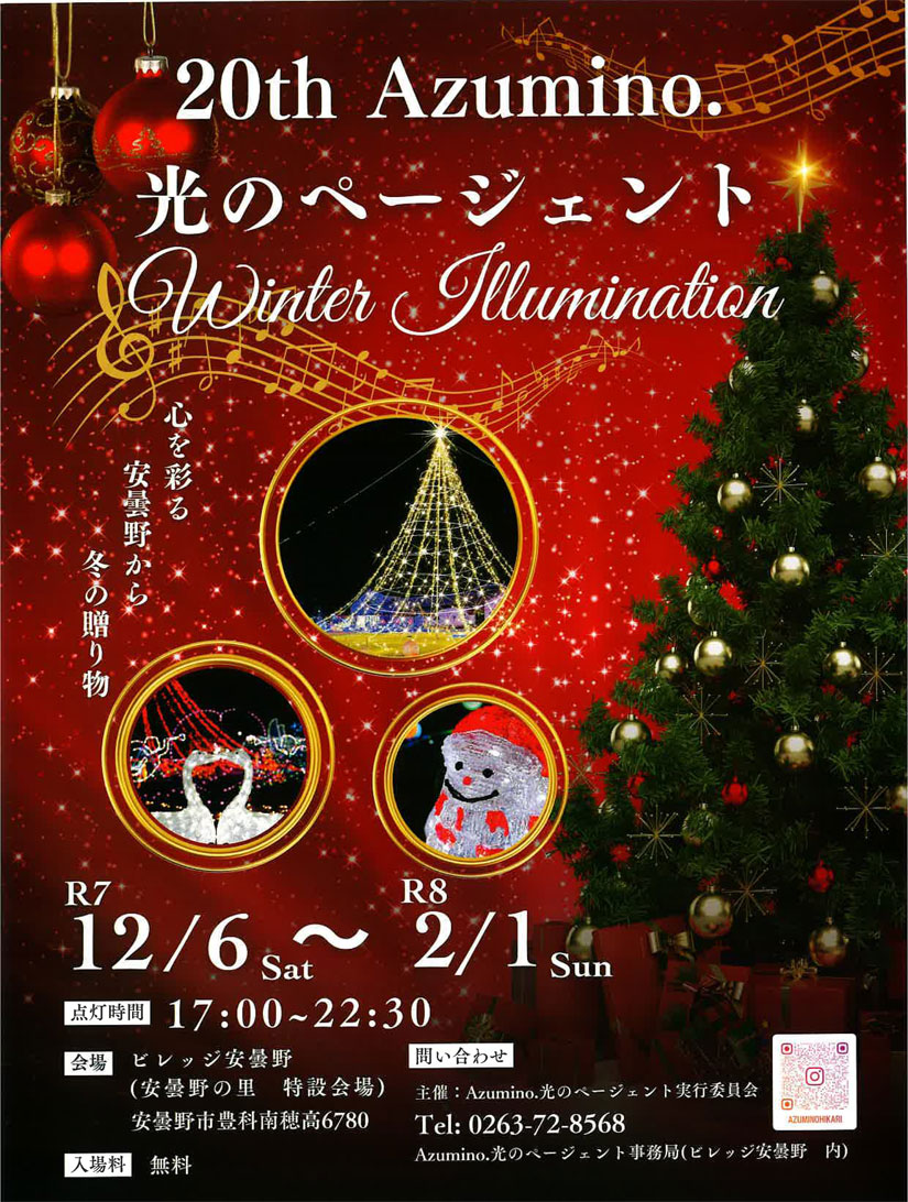 2025年12月6日(土)から2026年2月1日(日)まで長野県安曇野市の「安曇野の里」ビレッジ安曇野の西側広場で、冬のイルミネーションイベント『Azumino.光のページェント』が開催。第20回目となる今年は、メインツリーを中心に地域のボランティアが装飾した個性豊かなイルミネーションが会場を幻想的にライトアップ。