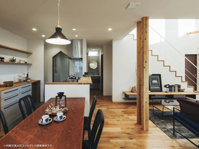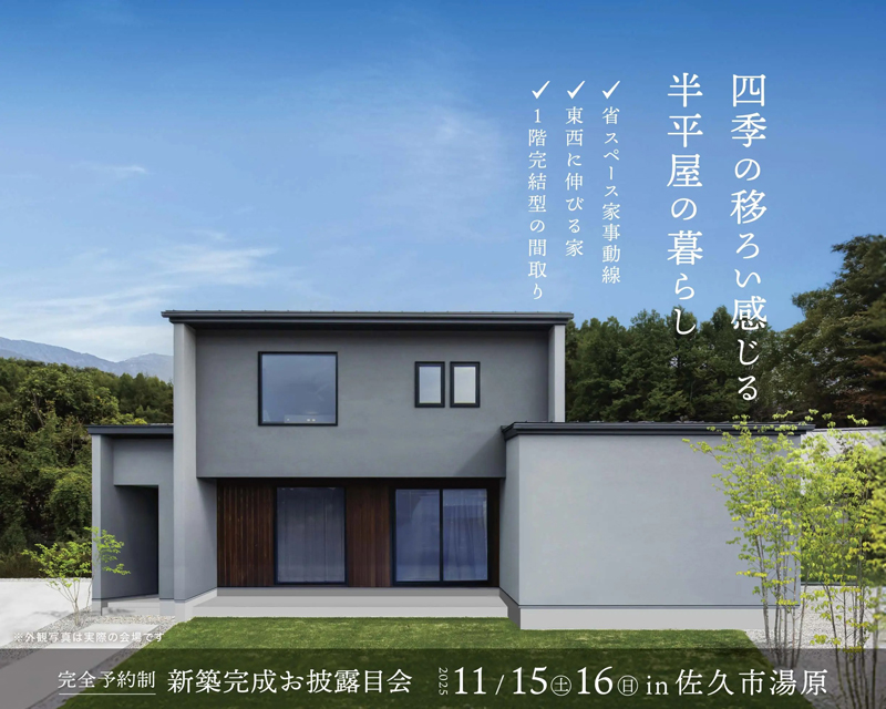 今回お披露目されるのは、「四季の移ろい感じる 半平屋の暮らし」をコンセプトにした住まい。東西に広い敷地を活かした採光設計と、ワンフロアで生活が完結する半平屋スタイルが特徴です。