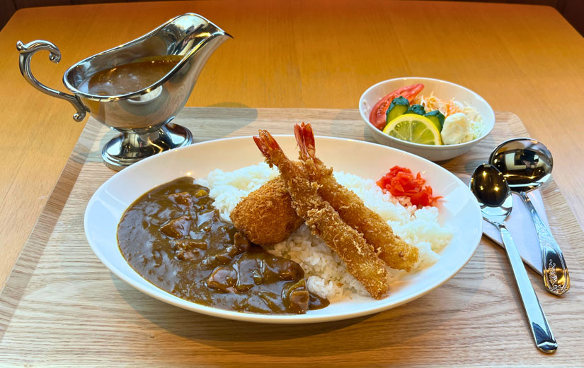 カニクリームコロッケとエビフライ2本がトッピングされた「フライカレー」。画像は普通盛り。