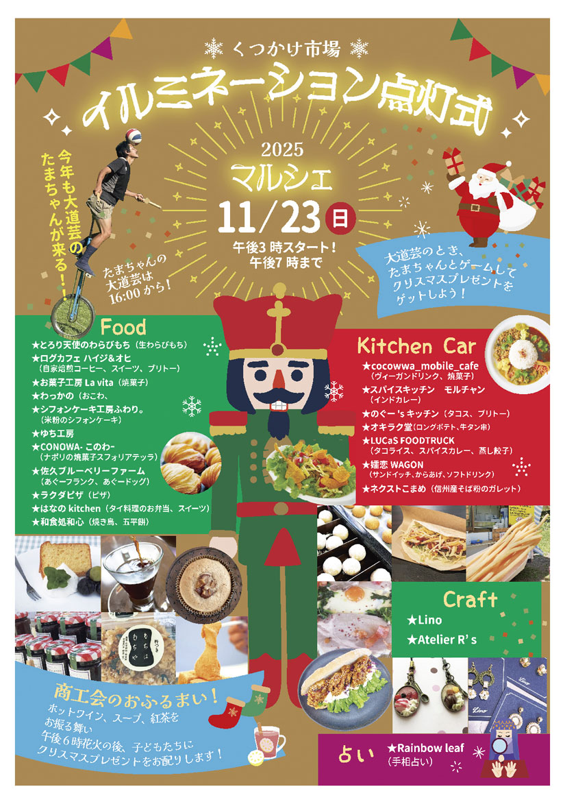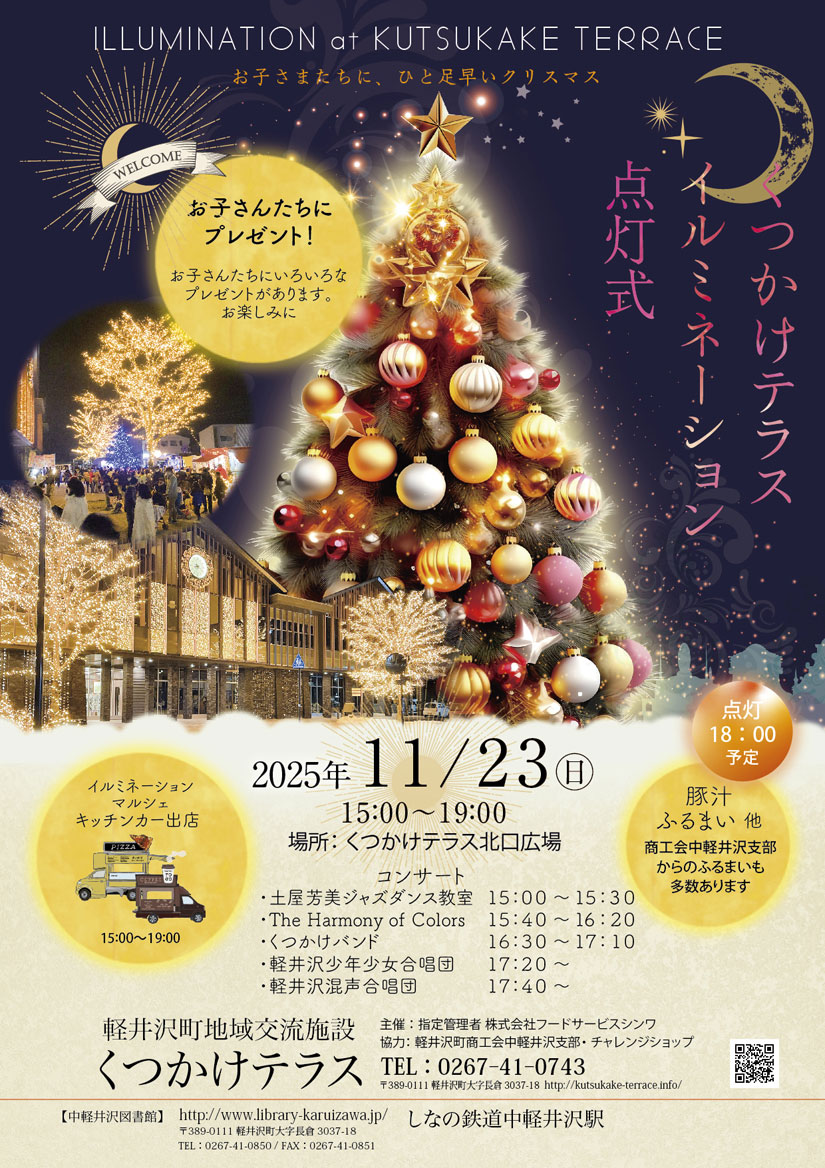 長野県の中軽井沢駅前で、『くつかけテラス イルミネーション点灯式』と『イルミネーション点灯式 2025マルシェ/くつかけ市場』が、2025年11月23日(日・祝)に開催。