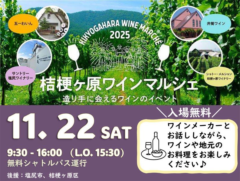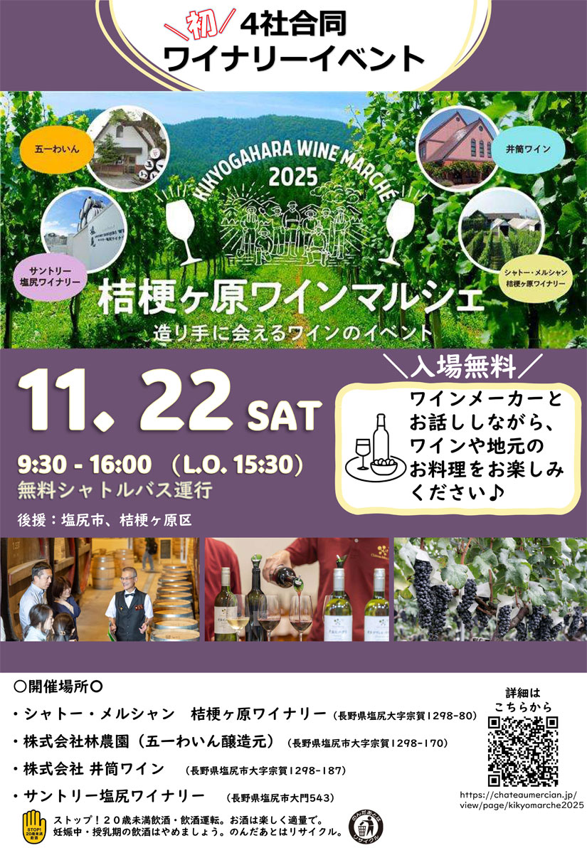 2025年11月22日(土)に長野県塩尻市の地元ワインメーカーの「シャトー・メルシャン 桔梗ヶ原ワイナリー」「五一わいん(林農園)」「井筒ワイン」「サントリー塩尻ワイナリー」の4つのワイナリーを会場に『桔梗ヶ原ワインマルシェ』が開催。今回初めて4社合同で行います。