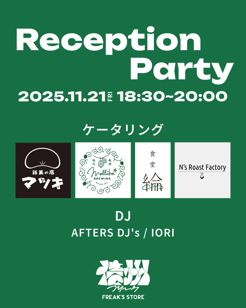 初日の11月21日(金)18時30分からは無料のレセプションパーティーも開催され、地元飲食店のケータリングを味わえるほか、DJが出演して音楽で会場を盛り上げます。
