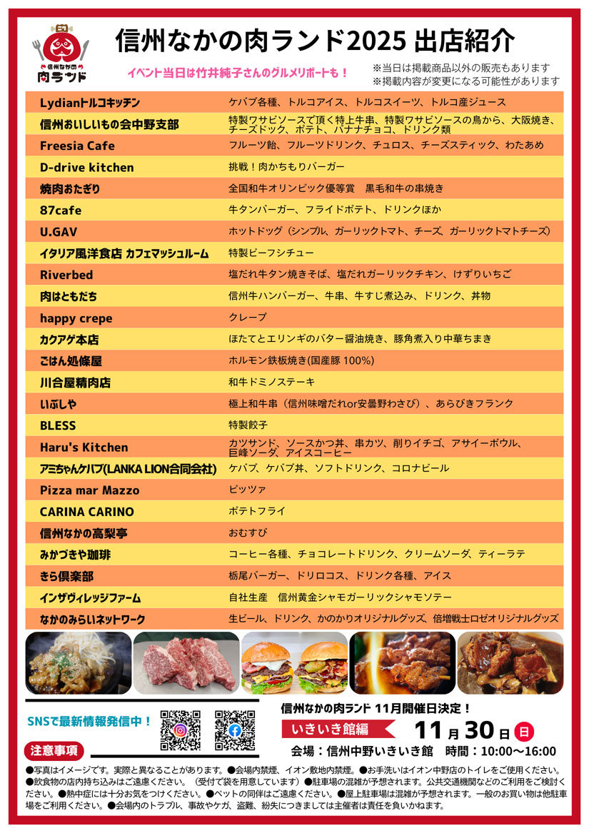 「11月30日(日)「信州なかの肉ランド2025 いきいき館編」の出店者が決定いたしました!!自慢の肉グルメを中心とした肉ランド過去最大の31店舗が出店いたします。当日は、お腹いっぱいに各店自慢のメニューをご堪能ください!!」と実行委員長。