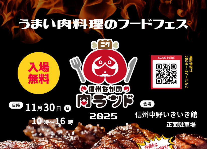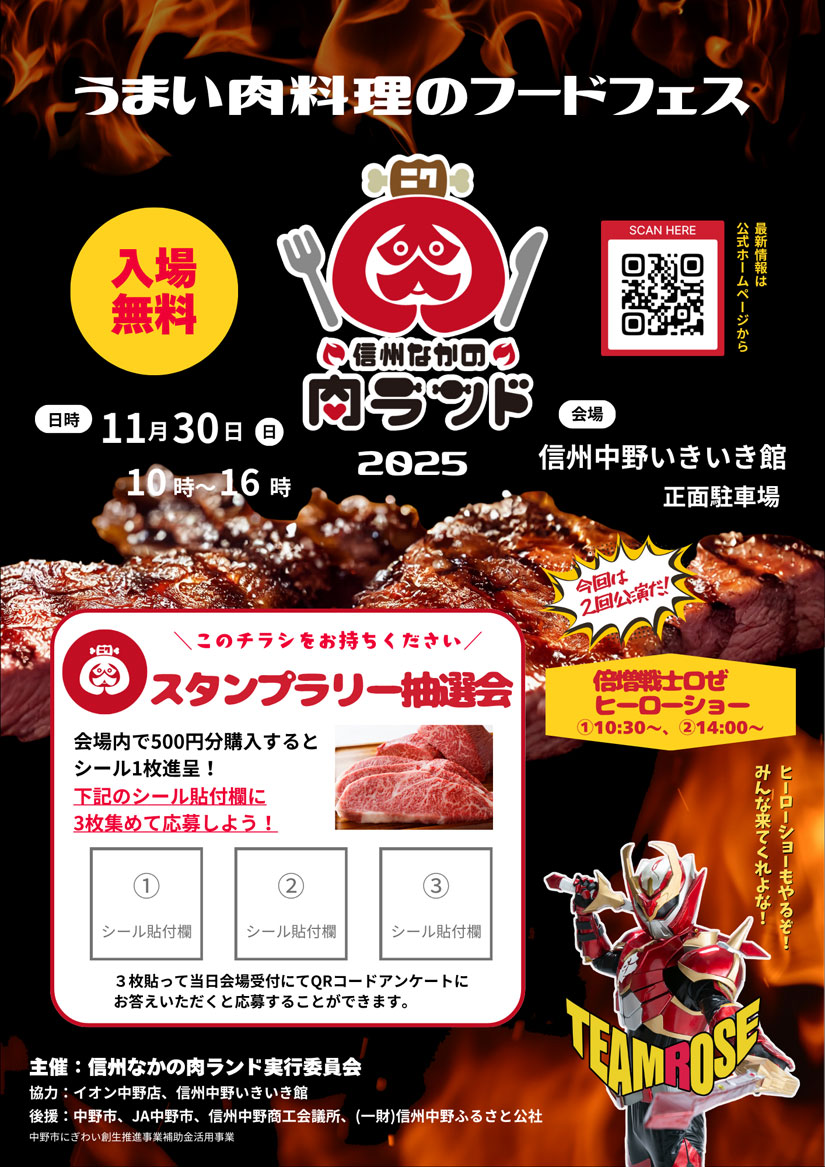 2025年11月30日(日)に長野県中野市の「信州中野いきいき館」の正面駐車場で『信州なかの肉ランド2025 いきいき館編』が開催。今回は、信州プレミアム牛や信州黄金シャモ、ホルモン焼きなど肉ランド史上最多の31店舗が集結。中野市をはじめ長野県内外の多種多様な肉料理が楽しめます。さらには、倍増戦士ロゼヒーローショーやスタンプラリー抽選会も行われます。