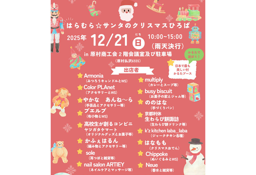 長野県の「八ヶ岳自然文化園」から車で9分ほどにある「原村商工会館」で、イベント『はらむら☆サンタのクリスマスひろば~みんなで集めたプレゼントを能登へ~』が、2025年12月21日(日)に開催。