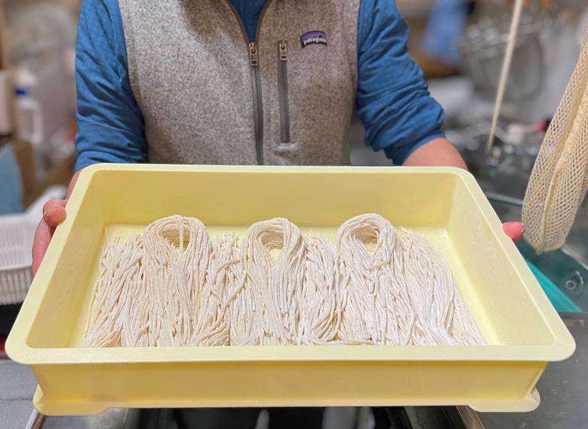 材料は国産小麦とかん水などシンプルですが、熟成のさせ方や寝かし方はうどんのやり方をアレンジ。一般的なラーメンとは異なる、うどんのようなもちもちとしたコシのある多加水麺が完成したそう。
