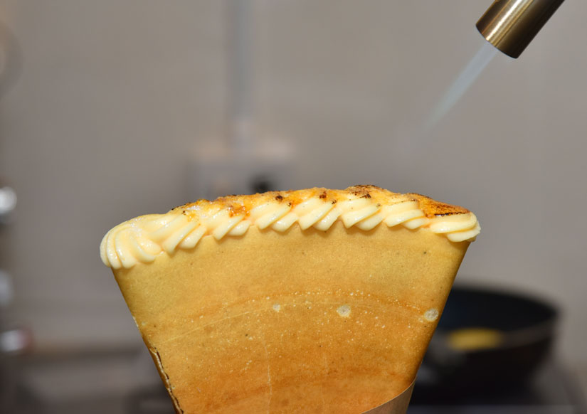 クリームのデコレーションや、バナーでブリュレする様子など、目の前でパフォーマンスも楽しめます。