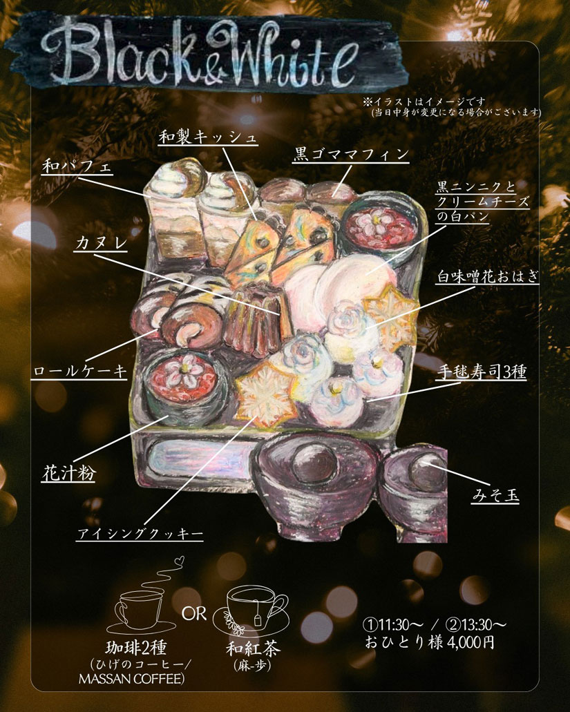 なかでも目玉は「和のアフタヌーンティー(和フタヌーンティー)」。午前と午後の2回開催。和栗キッシュや黒ゴママフィ、黒ニンニクとクリームチーズの白パン、白味噌花おはぎなど和をテーマにしたメニューが味わえます。