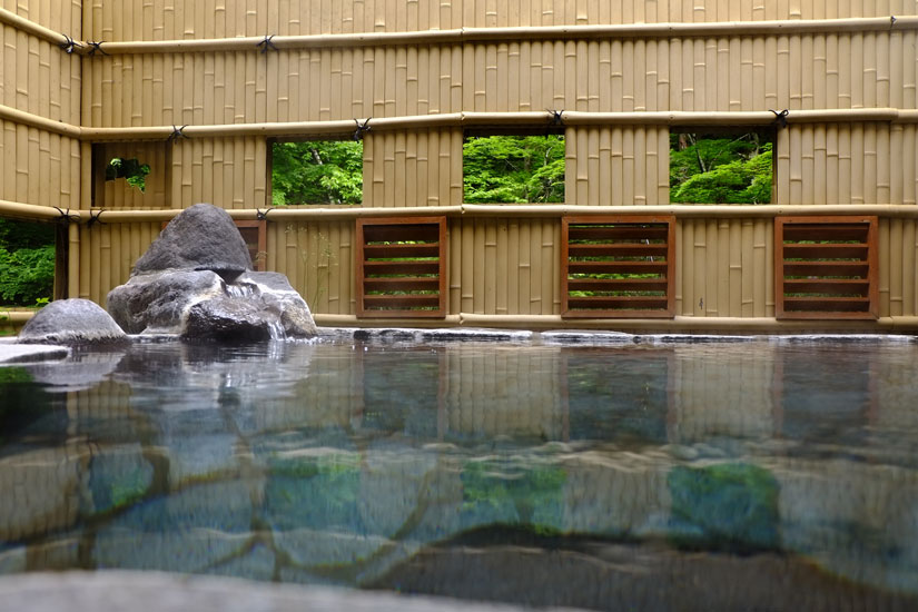 男湯・女湯共に内村渓谷を眺めることができる露天風呂があり、四季折々の景色を眺めながら温泉を楽しむことができます。木の温もりと岩の質感が調和した露天風呂からは、自然の息吹を感じながら身も心も解きほぐされるひとときを過ごせます。