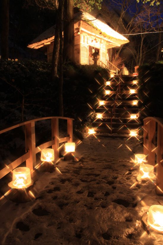 橋と階段の両脇に規則正しく並べられた氷灯ろうからは、雪に反射してキラキラと星のような輝きが放たれます。奥に見える文殊堂の静けさと灯りの温かみが、この地に伝わる伝説と信仰の深さを感じさせてくれます。