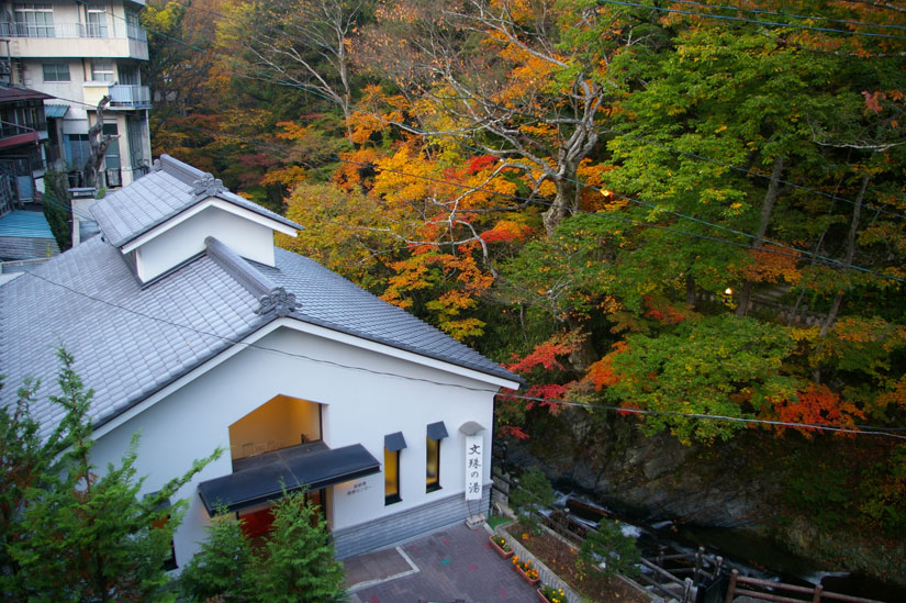 鹿教湯温泉を訪れたら、ぜひ立ち寄りたいのが「文殊の湯」です。文殊堂近くの旧源泉地にあるこの共同浴場は、白壁の外観が秋の紅葉に映える落ち着いた佇まい。5つの源泉から湧き出る高温の湯を混合しており、肌に優しい温泉が楽しめます。