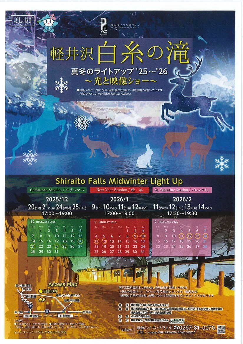 長野県・軽井沢町の「白糸の滝」で『軽井沢白糸の滝 真冬のライトアップ’25~’26』がクリスマス・新年・バレンタインと3つの期間に分けてそれぞれ4日間ずつ、計12日間開催。光量、色味、制作方法など、環境に配慮した演出で、自然にやさしい光のショーが楽しめます。