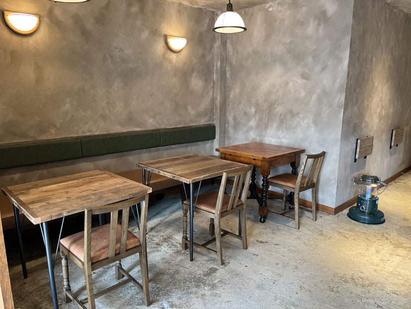 店内は、ヨーロッパ・北欧テイストをベースにしたアンティーク調に。壁や天井は、本店「kitchen&bar SABO。」の常連さんやスタッフ、スタッフの家族などが塗り、みんなで作り上げた温かみのある空間に。夏はオープンテラスにもできるような開放的な店舗作りを心掛けたそう。