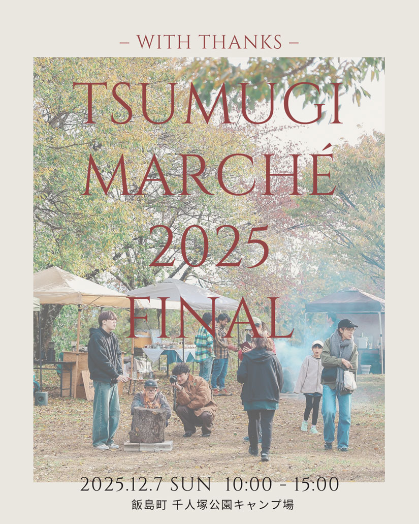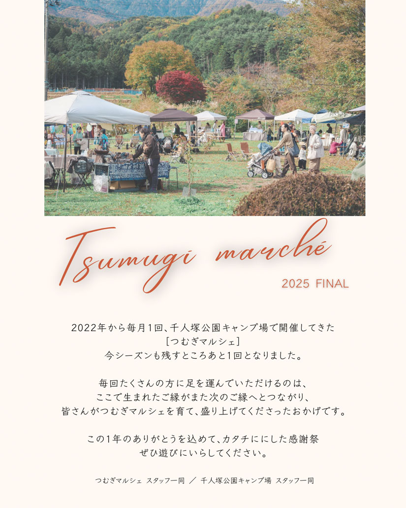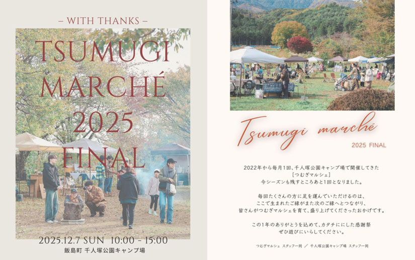 2025年12月7日(日)に長野県上伊那郡飯島町の千人塚公園キャンプ場で『つむぎマルシェ』が開催。自然豊かな屋外3エリアと屋内の2施設に、農産物販売やフード、ドリンク、リラクゼーション、クラフト作品の出展と41ブースが集まります。毎月1回開催の定期マルシェで、今シーズン最後の開催となり、1年間の感謝を込めて行われます。