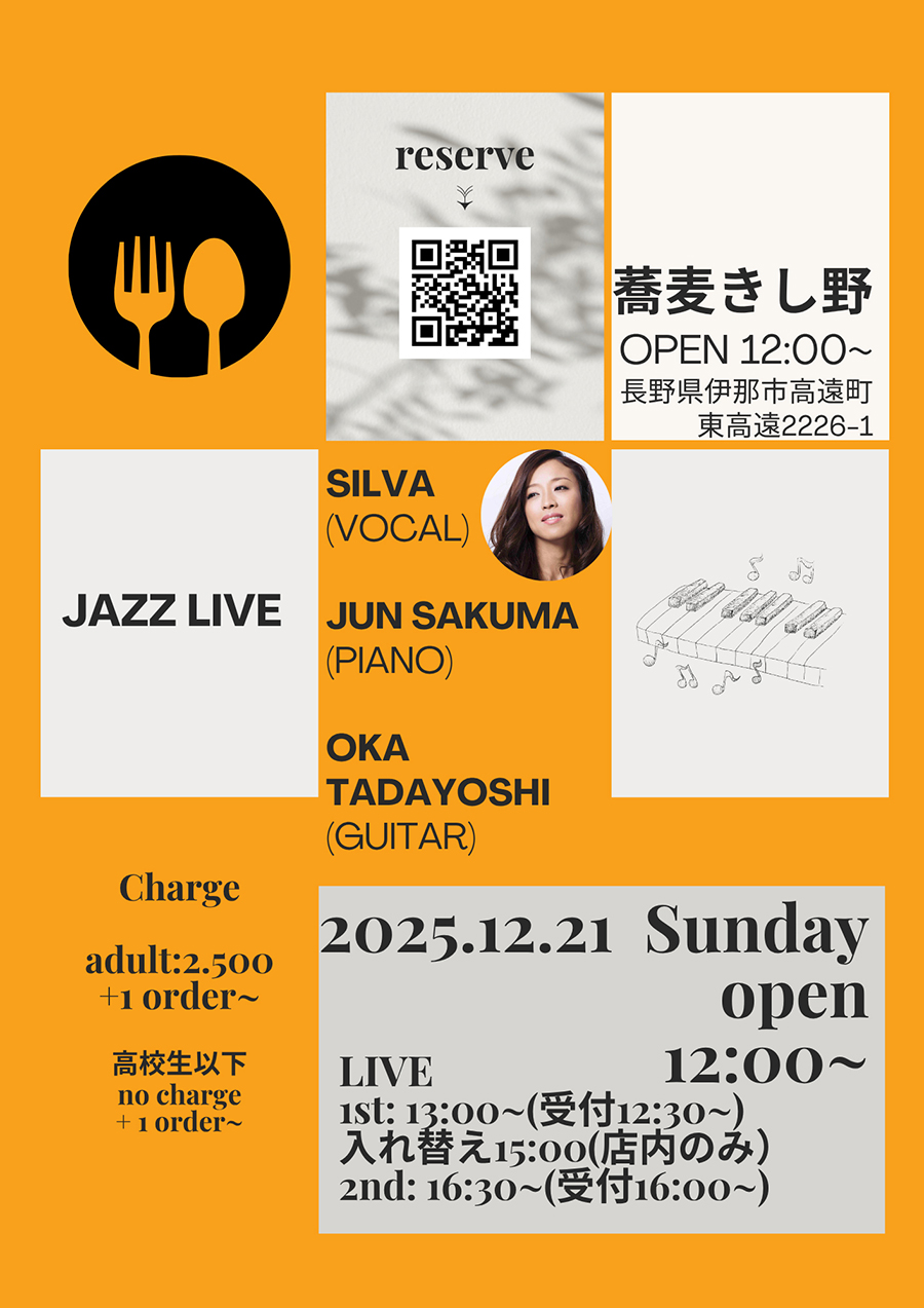 「SILVA JAZZ LIVE」※入れ替え制 1st:13時~(受付12時30分~)、2nd:16時30分~(受付16時~)