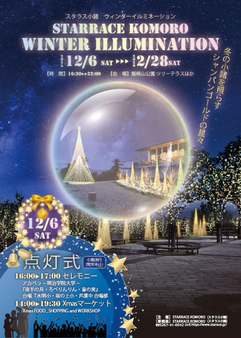 2025年12月6日(土)から2026年2月28日(土)まで、長野県小諸市の「飯綱山公園」と「STARRACE KOMORO(スタラス小諸)」で『STARRACE KOMORO WINTER ILLUMINATION(スタラス小諸 ウィンターイルミネーション)』が開催。今年は会場一帯がシャンパンゴールドのイルミネーションで彩られるほか、大型のクリスマスツリーも設置されてロマンチックな雰囲気を演出。また初日には、温かいドリンクやフードを味わったり、クラフトのワークショップが体験できる『クリスマスマーケット』や『点灯式』が行なわれます。