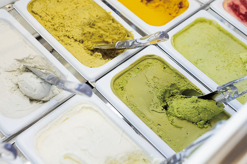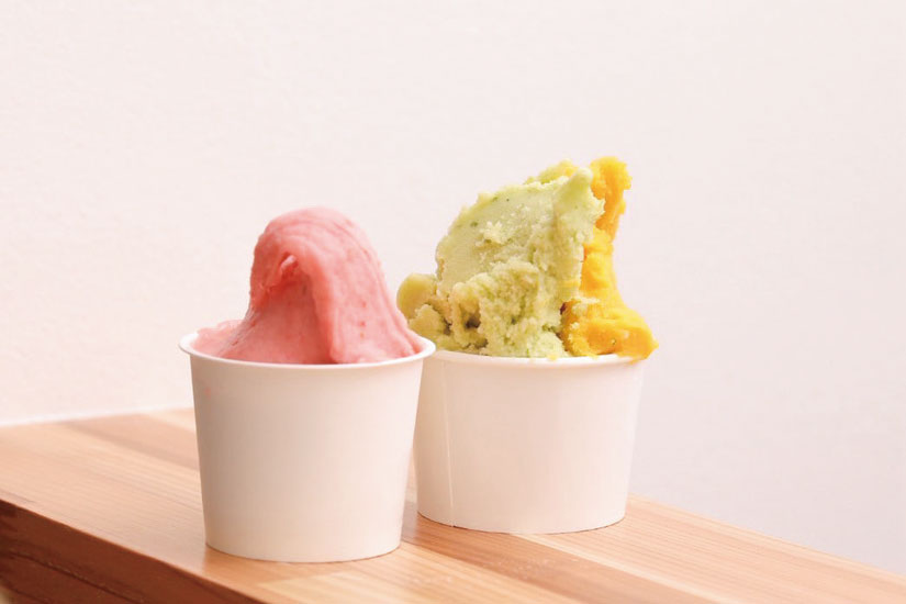 ジェラートの本場イタリアの国際大会で何度も受賞歴のある「MALGA GELATO」のジェラート。フレーバーは自然の恵みをそのまま生かしています。同店では、大会で入賞した味わいも楽しめます。「シングル」から「トリプル」まで注文可能。写真は「パインセロリりんごのソルベ」「マンゴーパッションライム」ほか。