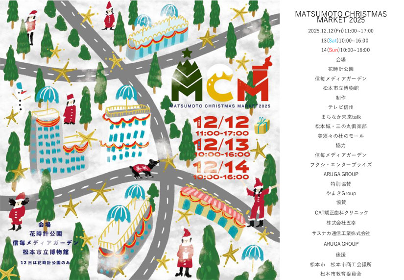 2025年12月12日(金)・12月13日(土)・12月14日(日)の3日間、長野県松本市の「花時計公園」「信毎メディアガーデン」「松本市立博物館」の3会場で『MATSUMOTO CHRISTMAS MARKET2025(松本クリスマスマーケット2025)』が開催。クリスマスをテーマに、県内外から66店が出店。温かいフード&ドリンクが味わえるキッチンカーや、この時期らしいアイテムも揃うクラフト店、子どもも楽しめるワークショップが松本の中心市街地に集まります。