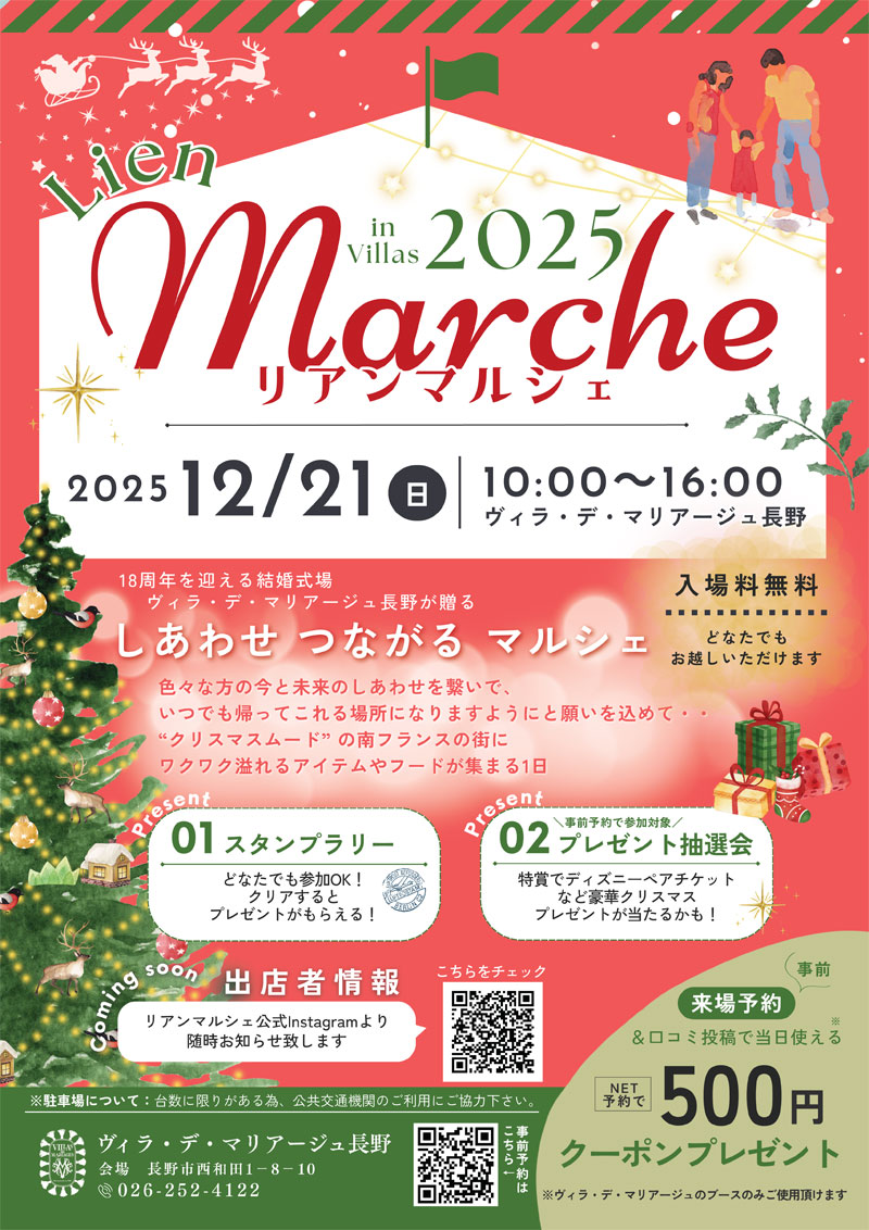 長野市で18周年を迎える結婚式場「ヴィラ・デ・マリアージュ長野」で、『Lien Marche(リアンマルシェ)』が、2025年12月21日(日)に開催。