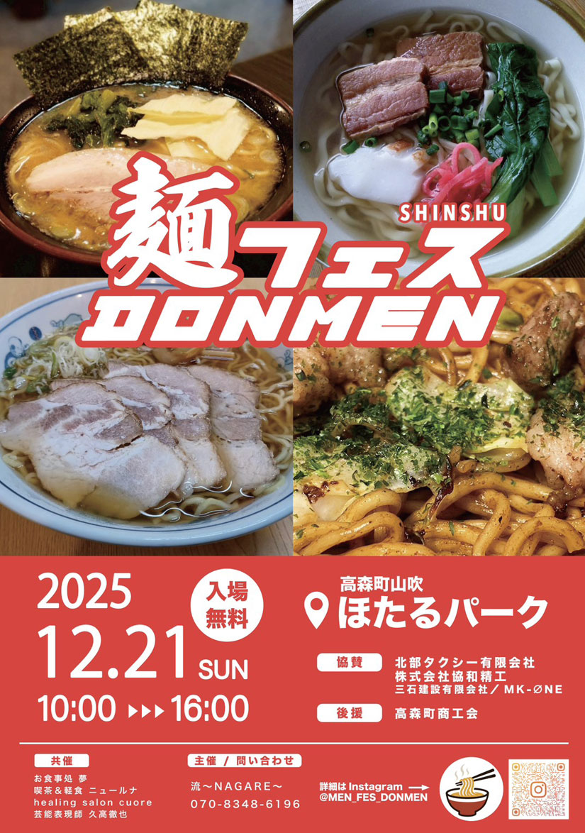 2025年12月21日(日)に長野県下伊那郡高森町の「高森町山吹ほたるパーク」で『信州麺フェスドン麺2025in高森町』が初開催。麺をテーマにした食文化の祭典として、ラーメンなどの麺類などを含むフード・クラフト・リラクゼーション・ワークショップなど合わせて50店が集結。